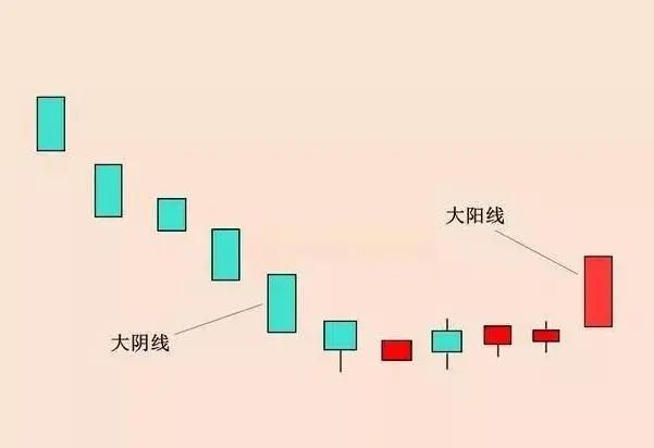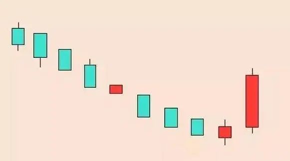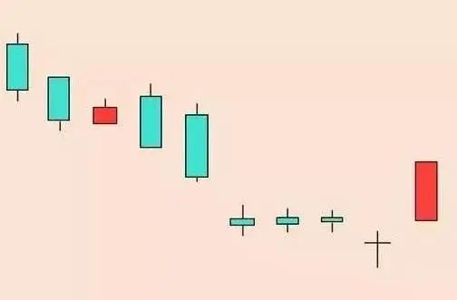 3、在下跌过程中,出现连续的小K线,几根小K线横向整理(比如三根:第四天在耕地的位置走出一个十字星,第五天大多数会收一个大阳线)。这种形态出现说明空方力量已经匮乏,经过短时间蓄力后虽然继续下压,但是很快被多方驳回,在最终的博弈中空方力量殆尽,多头开始发力拉升。
