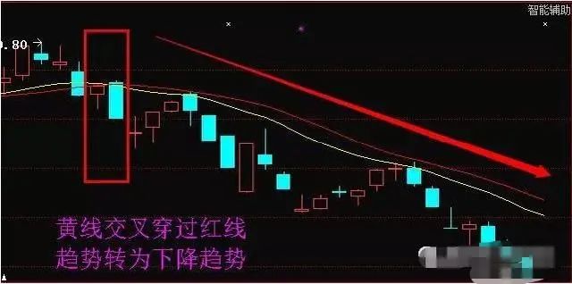 如果黄线处于红线的上方就为上升趋势,黄线处于红线的下方就为下降趋势,而我么需要的是黄线刚交叉穿过的时间段几位底部的确认,如图所示: