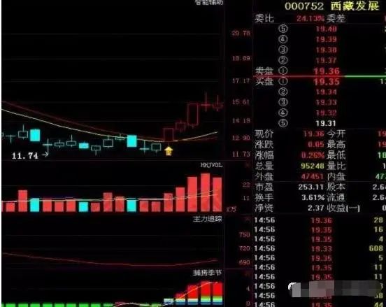 如上图所示,上证指数在2012年1月9日的时候,放量大阳线突破了辅助线,此时相应的K线指标给出了B点买入信号,这个时候显然我们就可以选股了。此时大家可以关注西藏发展的这只个股。